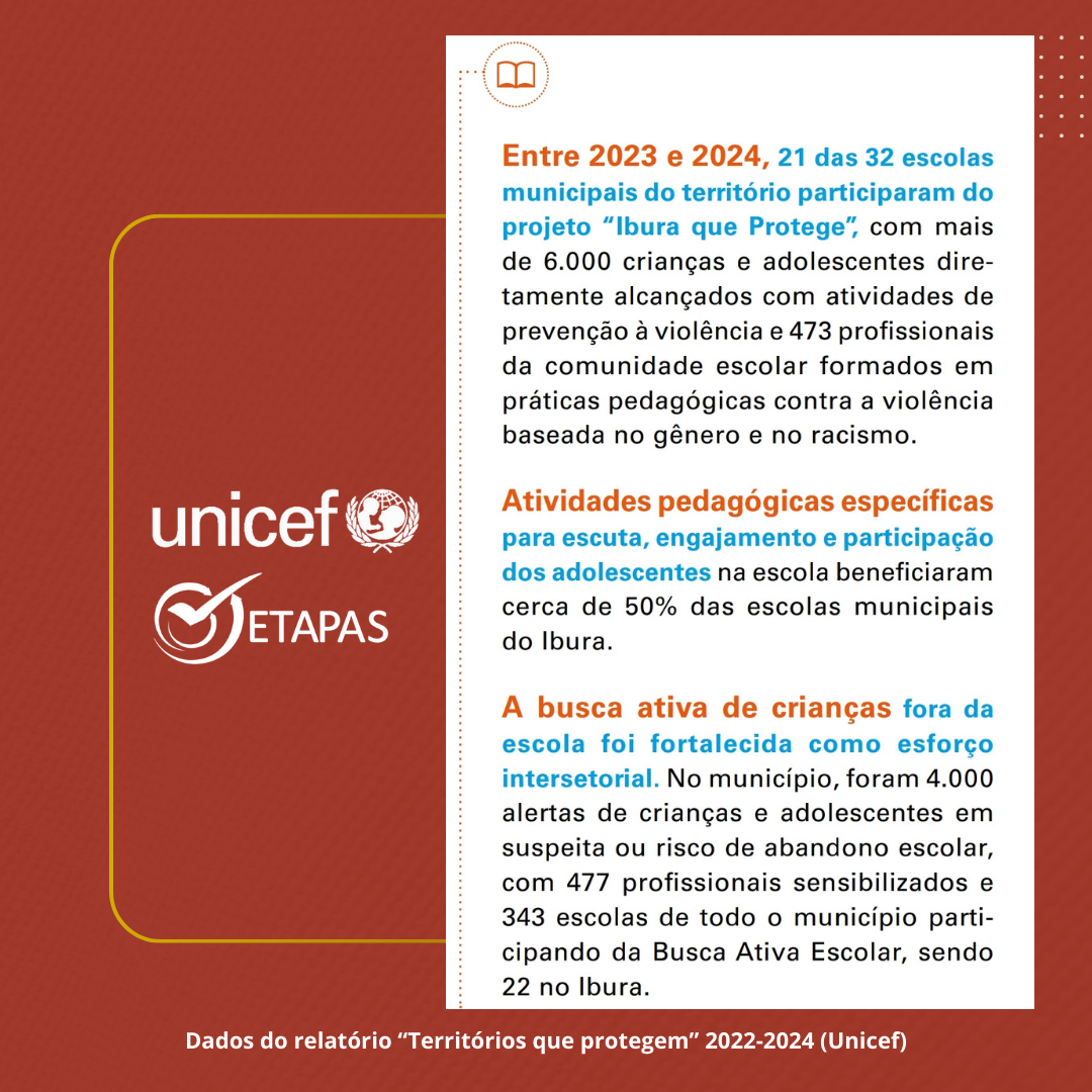 Conforme o relatório “Territórios que Protegem” 2022-2024, entre 2023 e 2024, 21 das 32 escolas municipais do Ibura foram alcançadas com o projeto “Ibura que Protege”, com 6 mil crianças e adolescentes entrando em contato com atividades de prevenção às violências e 473 profissionais formados em práticas pedagógicas contra violência baseada em gênero e racismo.