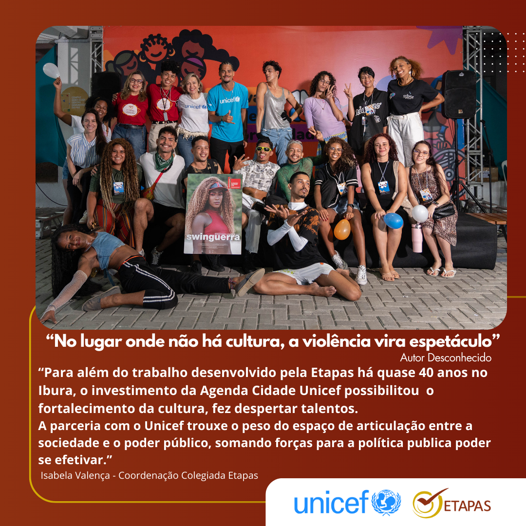 Como a Etapas atua há cerca de 40 anos no desenvolvimento territorial do Ibura, Isabela Valença (coordenação colegiada Etapas), ressalta que a parceria com o Unicef possibilitou também o fortalecimento da cultura, “fez despertar talentos”. Para ela, o Unicef trouxe o peso do espaço de articulação entre a sociedade e o poder público, “somando forças para a política pública poder se efetivar”.