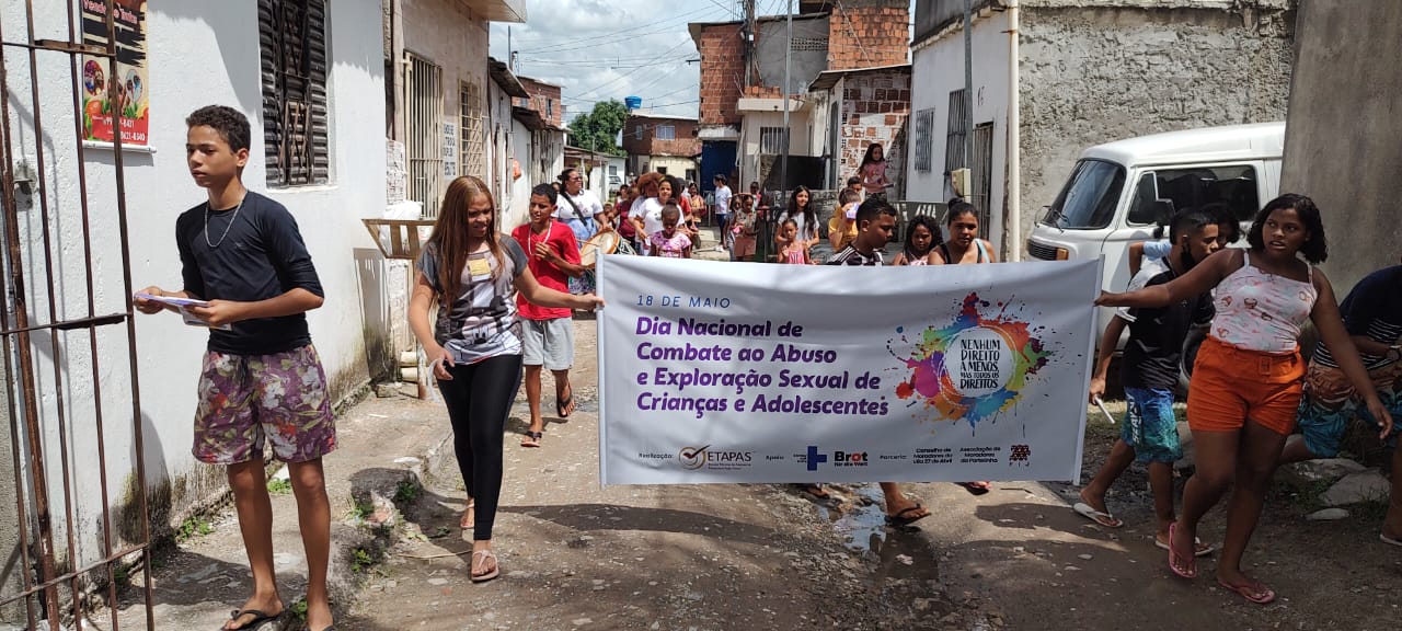 Crianças, adolescentes e famílias do Ibura – participantes do projeto “Nenhum Direito a Menos” (Etapas/KNH) de enfrentamento às violências doméstica, sexual e comunitária no território do Ibura – caminharam pelas ruas da Vila 27 de Abril e Portelinha com o objetivo de alertar a comunidade para a campanha do 18 de maio: Dia Nacional de Combate ao Abuso e Exploração Sexual de Crianças e Adolescentes.