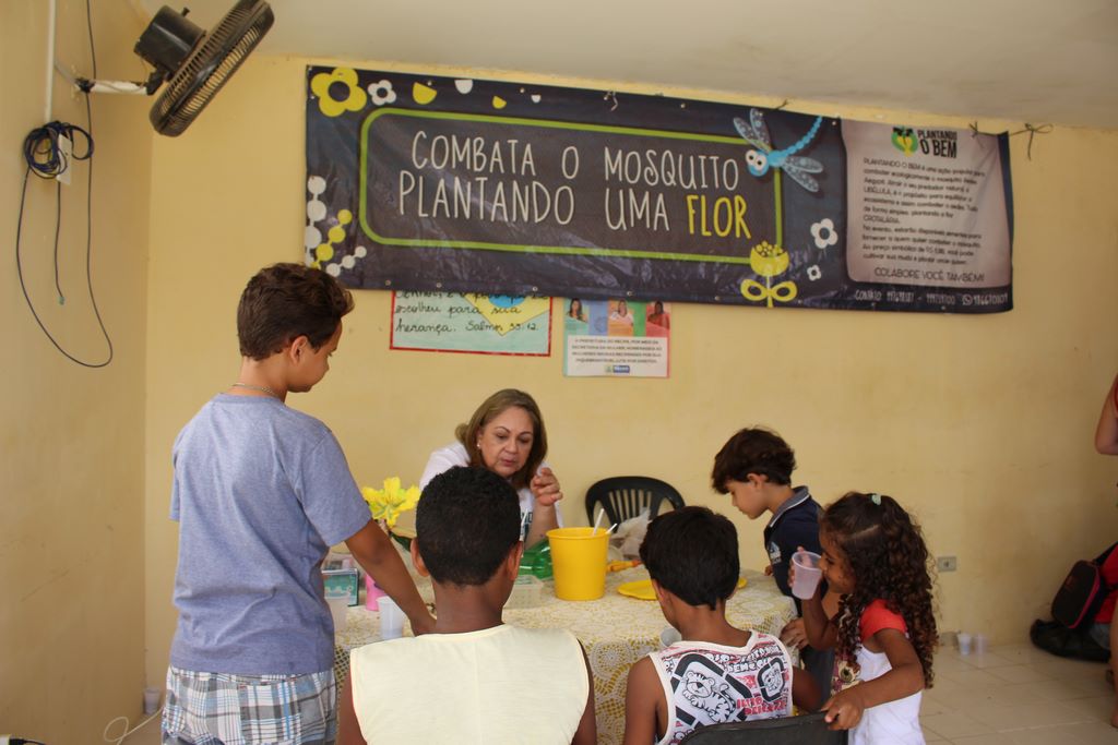 Os voluntários do grupo “Plantando o Bem” realizaram rodas de diálogo sobre o plantio da crotalária – planta que atrai a libélula que é predadora do Aedes Aegypti – e distribuíram as sementes.