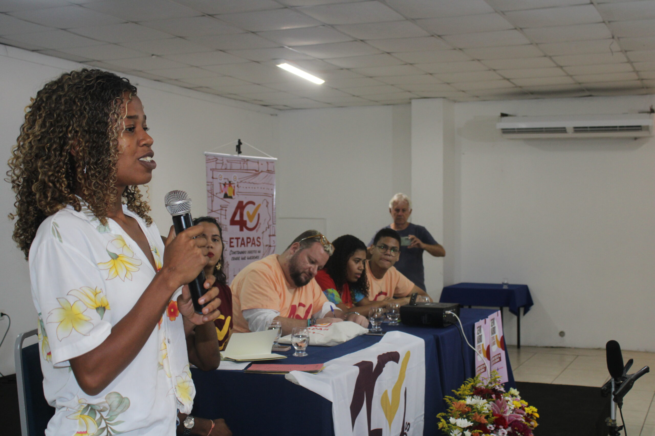 A primeira mesa de debates foi composta por Eduardo Paysan (Advogado – Especialista em Direitos Humanos, Mestre em Serviço Social), Alícia Patrícia e Gabriel Silva (Estudates e participantes do projeto “Nenhum Direito a Menos, Mas Todos os Direitos” – Etapas/KNH). Os adolescentes trouxeram experiências da realidade vivida no território do Ibura e o advogado falou da militância e na luta pelo direito de crianças e adolescentes.